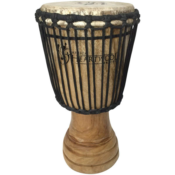 Africa Heartwood Project djembes are hand-carved experienced drum makers in West Africa. The Classical djembes are specially crafted with sound quality and playability in mind, with additional attention give to aesthetics. The 6-7" X 14-15" is a smallest size version of a full size djembe that we carry; this is NOT a toy or merely a souvenir that you would expect to fall apart after a few months or sound cheap. The Classical Heartwood Djembe 6x14 drum is fully playable, similar to a dumbek or a bongo. The size is suitable for most 2-5 year old children, but is also great for backpacking and as a substitute for a bongo, or when tuned high, a dumbek. All Classical Heartwood djembes are backed up by our satisfaction guarantee, and feature our 10 Point Quality Assurance. Purchase with confidence, knowing each djembe is always individually inspected and tested before shipping. Decorative carvings in the base typically consist of tasteful geometric patterns, similar to those shown in the photos above.