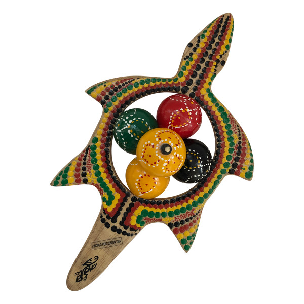 Add some colorful style to your hand percussion assembly with our interesting Lizard Ball Wood Shaker! Get that soft, distinctive egg-shaker sound, multiplied by 5. Great for use by percussionists, as well as in the classroom as an educational musical instrument. This shaker from World Percussion USA is covered by our satisfaction guarantee, and features: ---Five plastic egg-shaker balls installed on a painted lizard-shaped wood handle, makes a clear, rhythmic shaker sound---Brightly painted colors with variety of hand-painted dot-art designs similar to photo shown---Great for use by musicians or students as a hand-percussion instrument or educational musical toy---Hand-crafted by cultural artsians exclusively by World Percussion USA---The sale of this product supports the non-profit work of Africa Heartwood Project