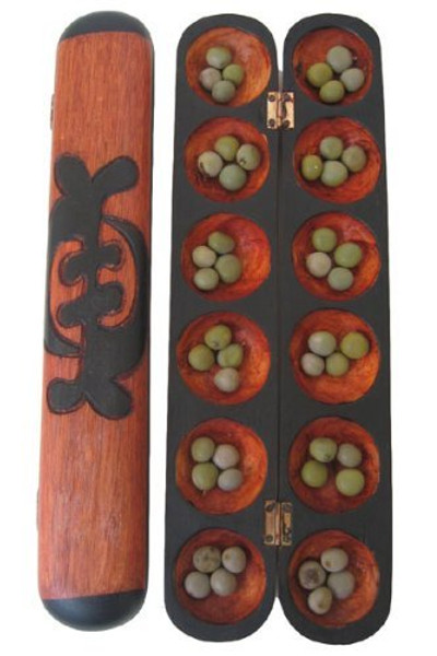 A wonderful, ancient board game that tests strategy and mathematical skill. Children in Africa have played this game for centuries, and adults spend hours and hours picking up and dropping stones into the board's 12 pits, socializing as they play. The game can be played non-strategically by young children not even able to count, so recommended age is 4+ (small parts not recommended for children under 4). As children learn basic arithmetic this game will improve their skill and train them to think before acting. This Oware game consists of a hand-carved board and 48 grey/green tear seeds. The board is the carrying case, so you don't need a bag - it is all self-contained. The Osese wood is given 12 pits, connected with 2 hinges, and stained on the inside and outside with redwood and black dye. An Adinkra symbol or other artistic image from Ghana (elephant, village scene, etc.) is carved on the top outside of the board. Purchased and imported using fair-trade practices. Play this African game with an authentic African board! Approximate size when closed: Length 15.5"; Width 2.5"; Height 2.5".